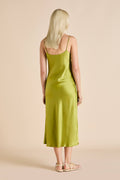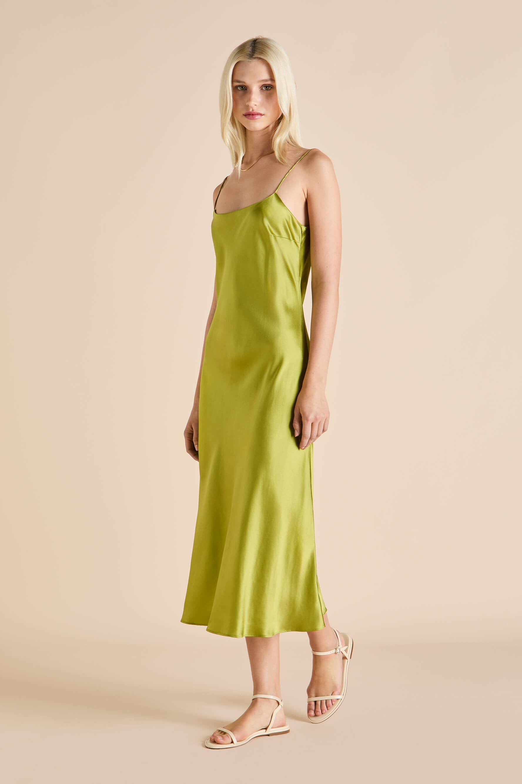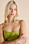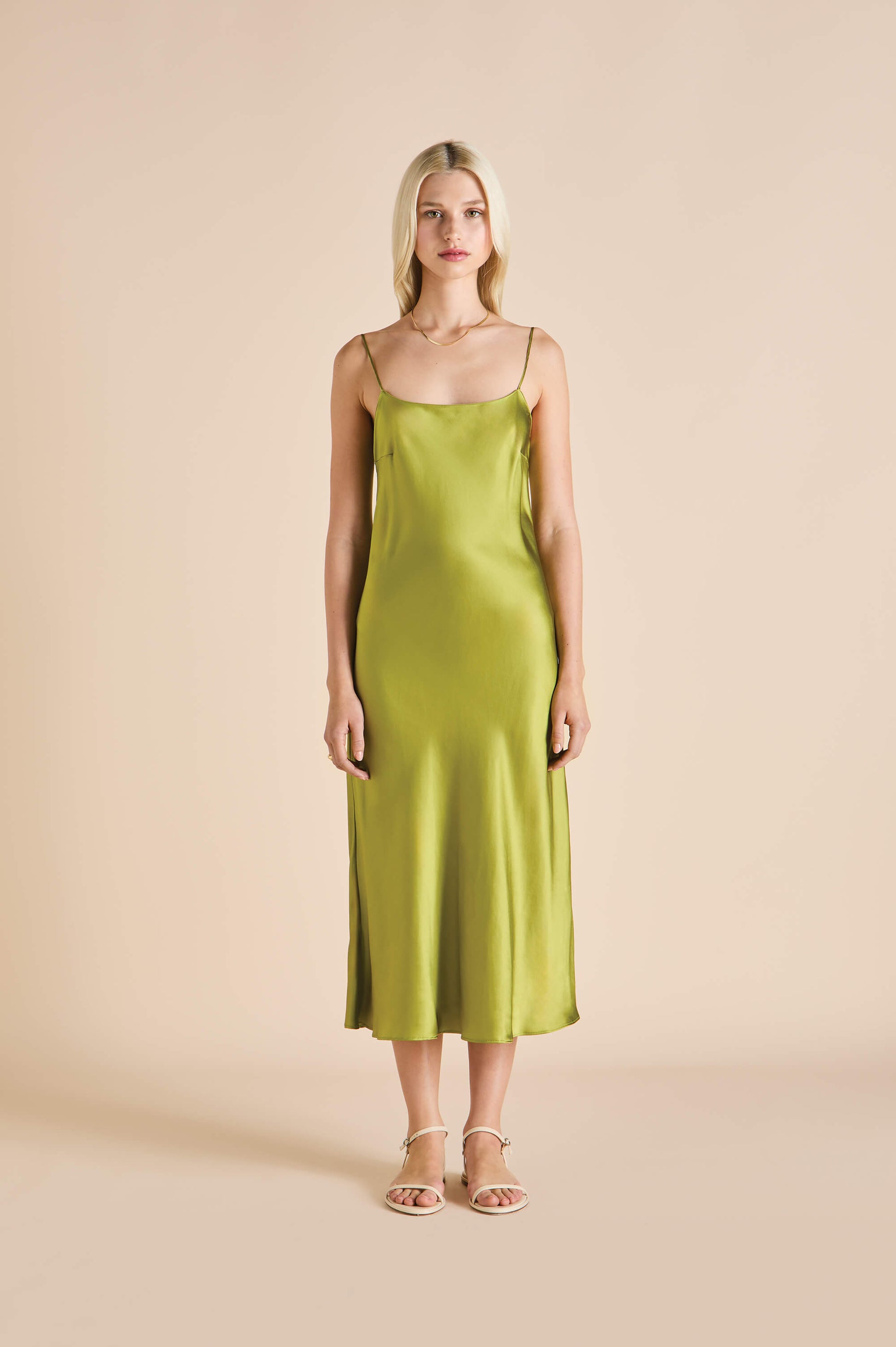 A favourite of social butterflies and society hostesses alike, our ankle-skimming Artemis Olive slip dress approaches going out and staying in with equal aplomb (just add diamonds). She’s cut to drape her wearer like dream and is spun from only the finest 19-momme silk satin, an Olivia von Halle signature.