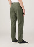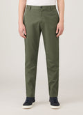 A slim-fit chino with a mid-to-low rise and a classic flat-front design. Crafted from lightweight Italian cotton with a touch of stretch for added comfort, and garment dyed for a soft, casual feel. Finished with a tailored waistband, button closure, zip fly, and single welt back pockets.