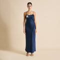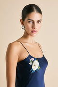 Our devotion to the perfect silk dress reaches new heights in sumptuous navy silk satin. Embellished with an intricate floral motif, she's ready to take the world by sparkling storm.