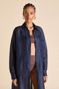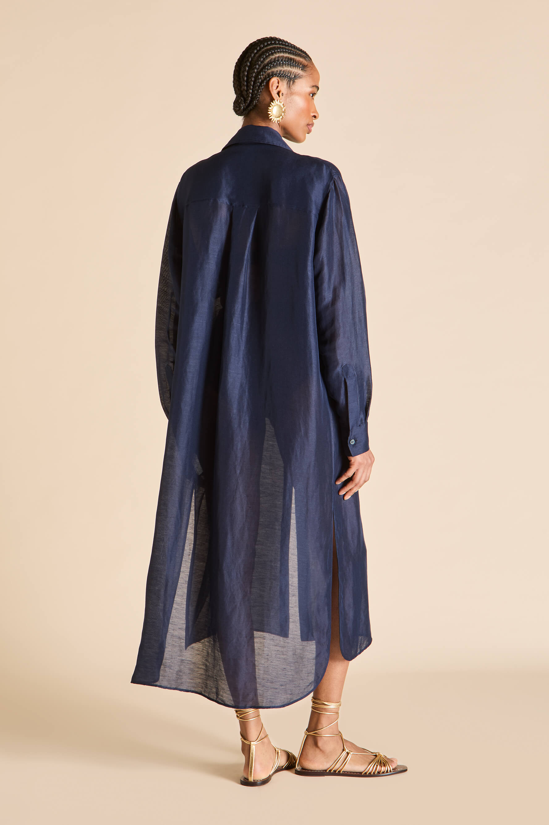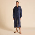 Hazy summer nights call for our Phoebe Navy shirtdress, a brand-new addition to our line-up. A younger sister to our Celeste nightshirt, she shares the same classic collar and gleaming buttons but arrives in a calf-skimming silhouette with deep side slits. And in anticipation of the warm weather, she's tailored from our breathable blend of linen silk that only gets softer with every wash.
