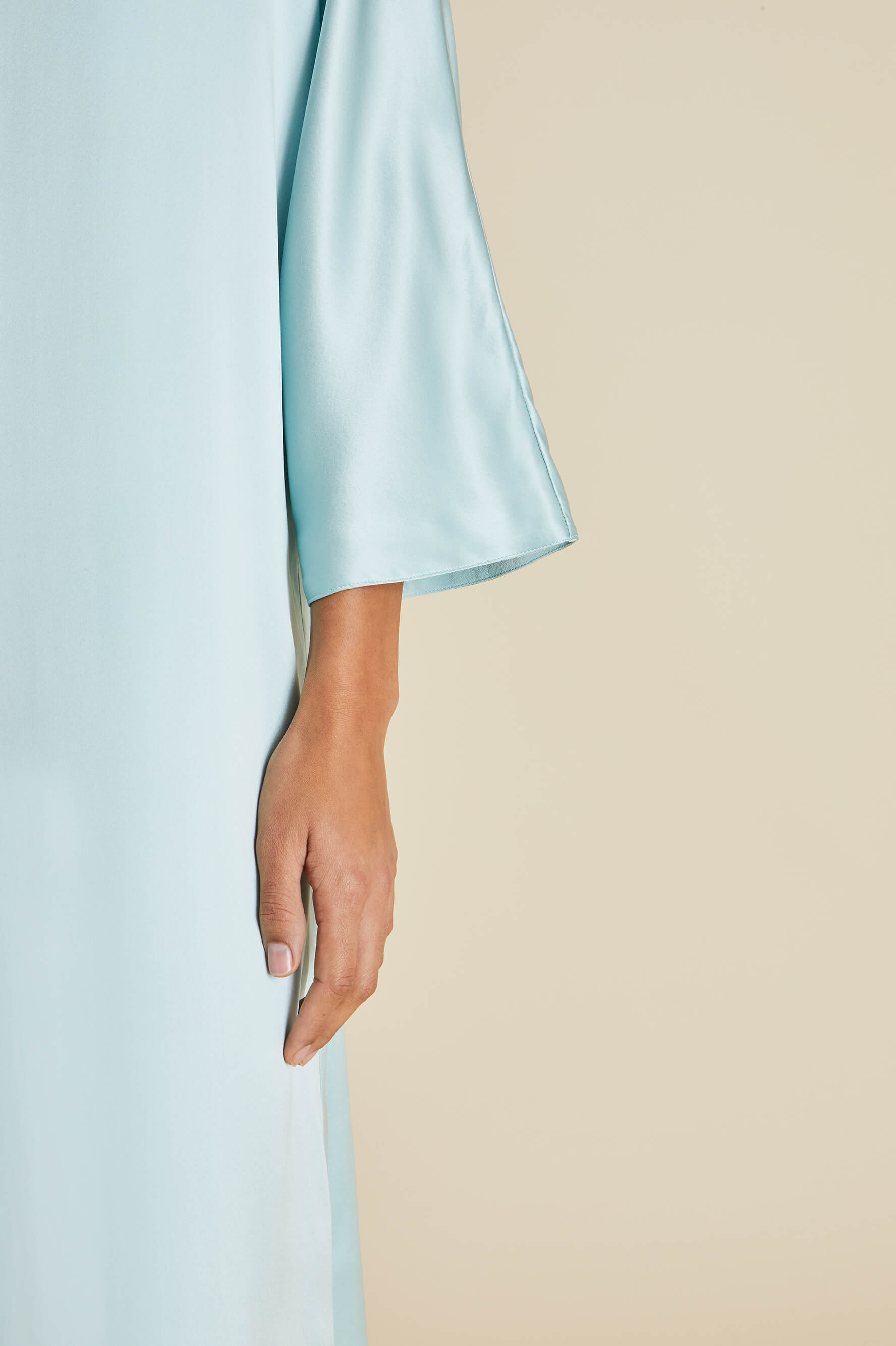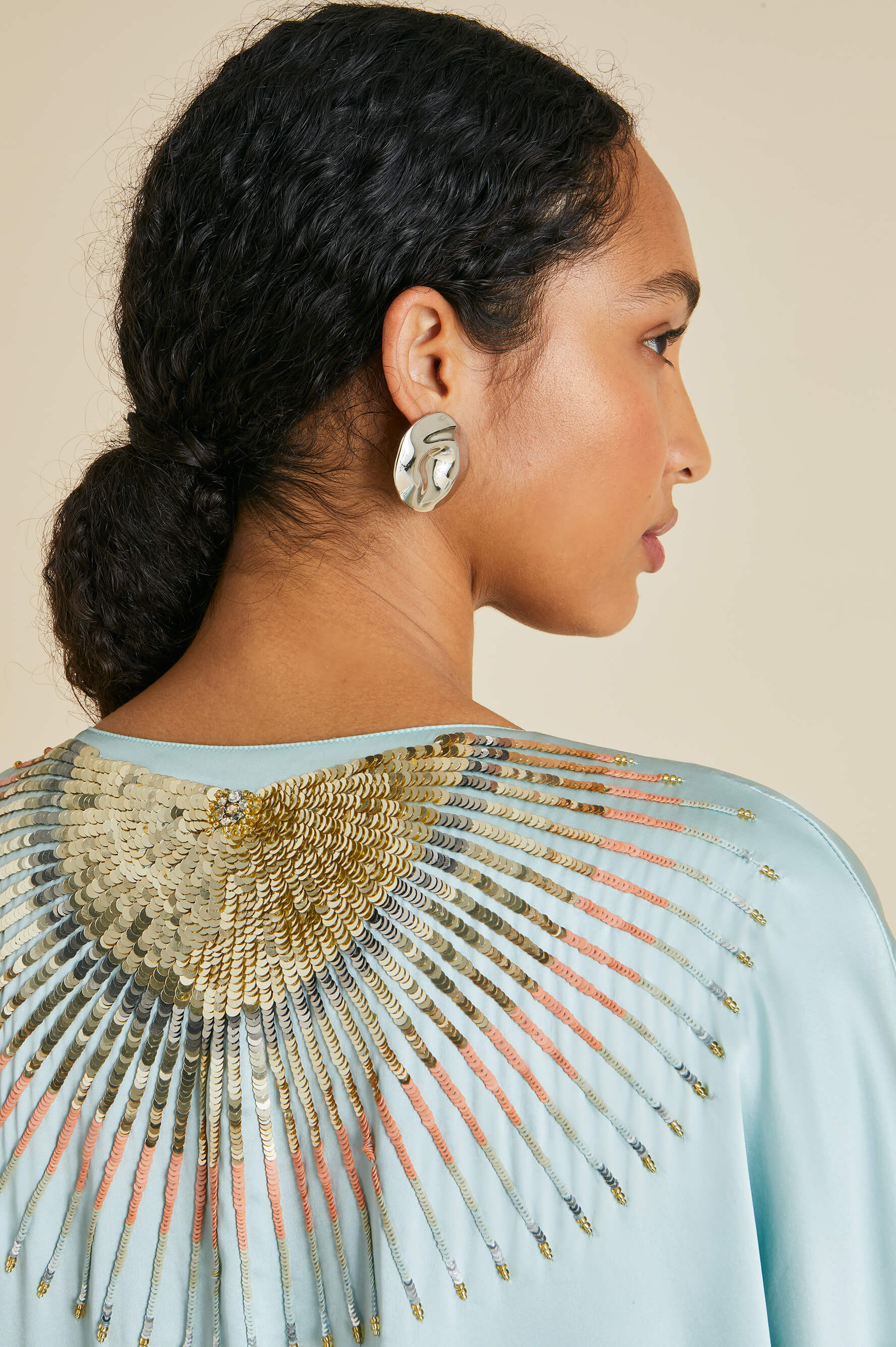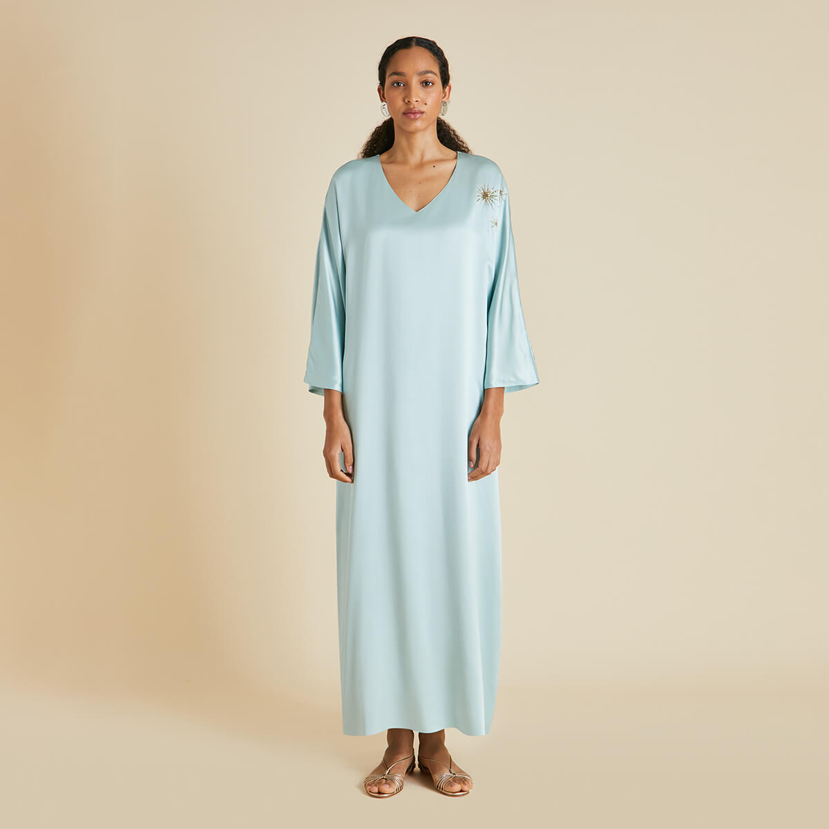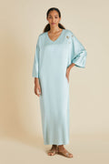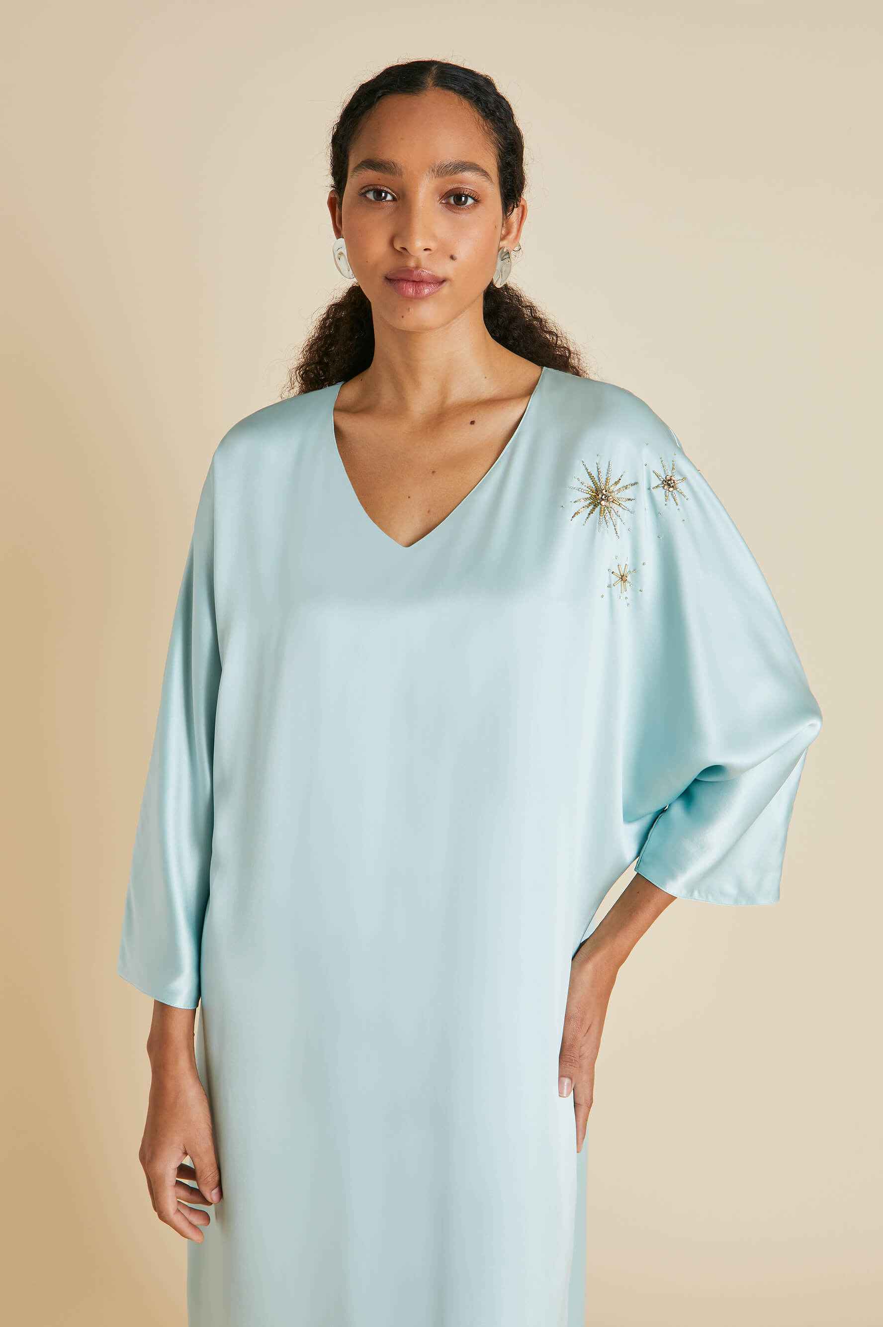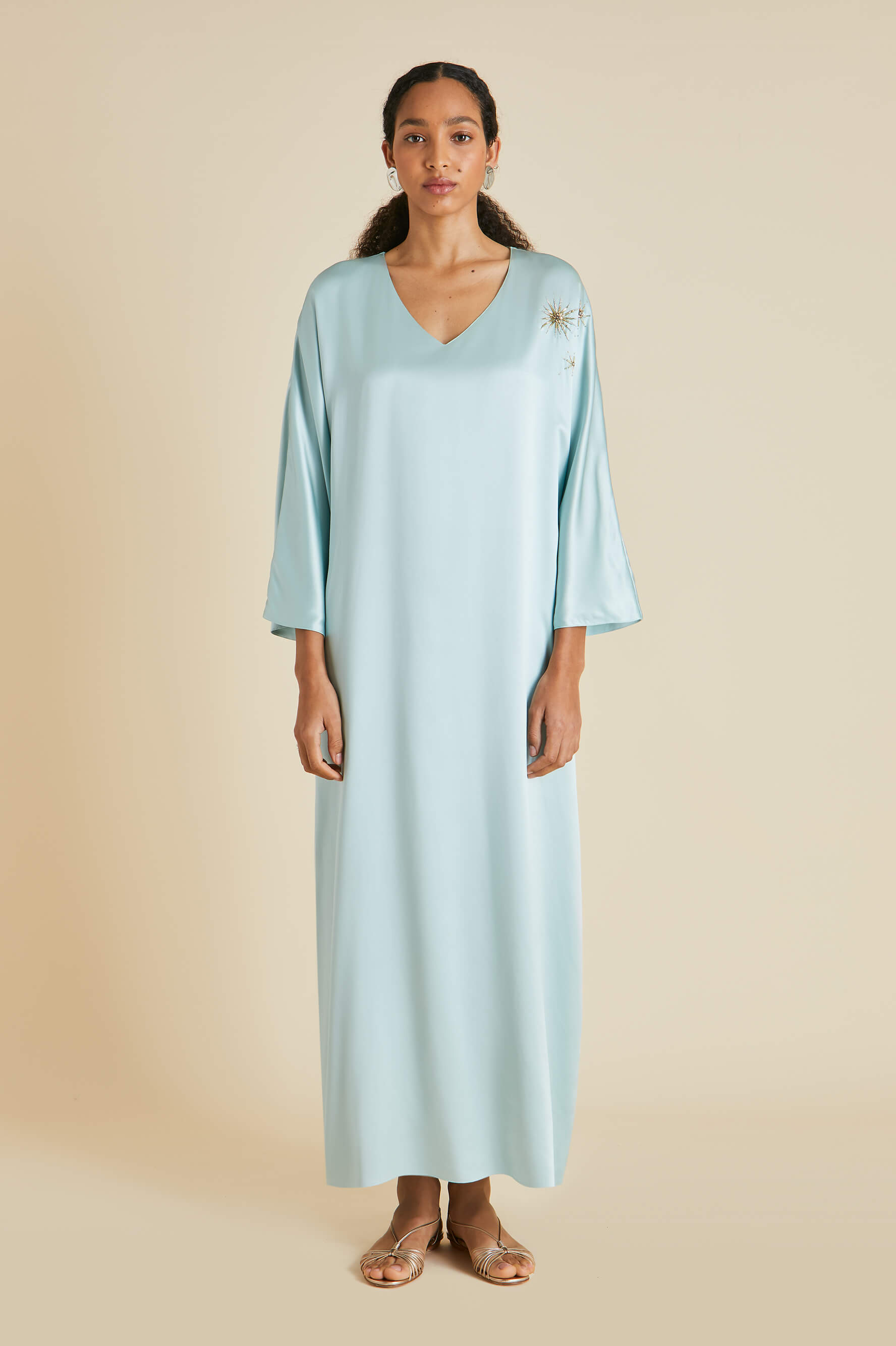 Named in honour of the formidable fashion editor and her trademark kaftans, our new-season Vreeland Incantation dress is crafted from a lightweight sandwashed silk in a dreamy shade of ash blue. For our limited-edition capsule collection, she steps out in especially lavish fashion, showing off no less than 21 hours of aari and zardosi embroidery. Characterised by gold threadwork and nature inspired motifs, both techniques have been lovingly practised for centuries to create revered pieces for kings, queens and bridal trousseaus.